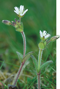 Hairy perennial, found in gardens and grasslands, and on disturbed ground. Flowering and non-flowering shoots occur. FLOWERS White, 5–7mm across, with 5 deeply notched petals (Apr–Oct). FRUITS Capsules. LEAVES Grey-green, in opposite pairs. STATUS Widespread and common throughout.