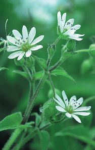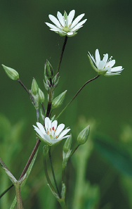 Rather straggly perennial with hairy stems. Found in damp woodland. FLOWERS White, 15–20mm across, the petals deeply divided into narrow lobes (May–Aug). Petals twice as long as sepals. FRUITS Capsules. LEAVES Oval, pointed; the lower ones stalked, the upper ones sessile. STATUS Widespread but local.