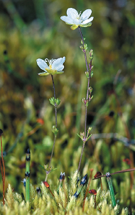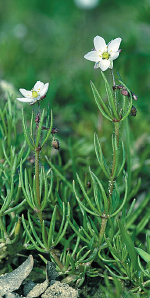 Wiry perennial; stems look ‘knotted’ due to clustered arrangement of leaves. Found on damp, sandy soils; often coastal. FLOWERS White, 10mm across, with 5 petals that are twice as long as sepals; 5 styles (cf. Spring Sandwort, p.34) (July–Sep). FRUITS Capsules. LEAVES Short, clustered. STATUS Widespread but local.