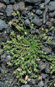 Creeping perennial of damp, bare ground. Forms mats comprising a central rosette with radiating shoots that root at intervals, giving rise to erect flowering stems. FLOWERS Green, petal-less and borne on side shoots (May–Sep). FRUITS Capsules. LEAVES Narrow, bristle-tipped but not hairy. STATUS Widespread and common. Four-leaved Allseed Polycarpon tetraphyllum is a much-branched annual with leaves in 2s and 4s. Flowers are tiny and whitish. Common only on Isles of Scilly; rare near coast in SW England.