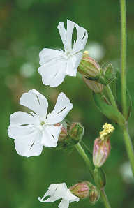 Hairy, branched perennial of disturbed ground and grassy habitats. Sometimes hybridises with Red Campion. FLOWERS White, 25–30mm across, with 5 petals; dioecious, male flowers smaller than females (May–Oct). FRUITS With erect teeth. LEAVES Oval, in opposite pairs. STATUS Widespread and common.