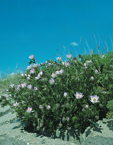 Straggling, often stickily hairy annual. Found on the drier, grassy upper margins of saltmarshes. FLOWERS Deep pink, 6–8mm across; 5 petals shorter than the sepals (May–Aug). FRUITS Capsules. LEAVES Narrow, fleshy, pointed; in opposite pairs on trailing stems. STATUS Widespread and locally common around the coast.