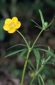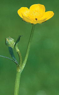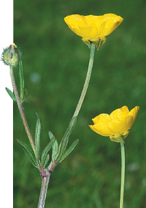 Downy perennial of damp grassland habitats. FLOWERS 18–25mm across, comprising 5 shiny, yellow petals with upright sepals; on long, unfurrowed stalks (Apr–Oct). FRUITS Hook-tipped, in a rounded head. LEAVES Rounded outline, but divided into 3–7 lobes; upper ones unstalked. STATUS Widespread and abundant throughout.