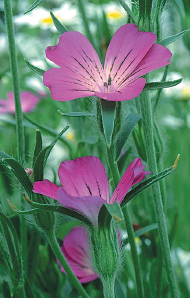 Distinctive, downy annual. Associated with arable fields. FLOWERS 30–45mm across, with 5 pinkish-purple petals and long, narrow and radiating sepals (May–Aug). FRUITS Capsules. LEAVES Narrow, grass-like. STATUS Formerly widespread and common but now extremely scarce and erratic because of agricultural herbicides.