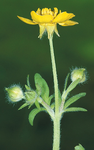 Hairy perennial of dry grassland, including chalk downs. Note the swollen stem base. FLOWERS 20–30mm across with 5 bright yellow petals and reflexed sepals; on furrowed stalks (Mar–July). FRUITS Smooth. LEAVES Divided into 3 lobes, each of which is stalked. STATUS Wide-spread and often abundant.