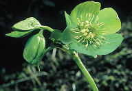 Scentless perennial of woodland on calcareous soils. FLOWERS Green (including the margins) with pointed sepals but no petals; in clusters (Feb–Apr). FRUITS Dry, many-seeded and splitting. LEAVES Divided into bright green, elongate lobes; not evergreen. STATUS Local and scarce, in central and S England and Wales.