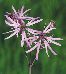Delicate-looking perennial of damp meadows, fens and marshes. FLOWERS Pink, with 5 petals, each divided into 4 ‘ragged’ lobes (May–Aug). FRUITS Capsules. LEAVES Narrow, grass-like, rough; upper ones in opposite pairs. STATUS Widespread and common, but decreasing through agricultural changes (e.g. land drainage).