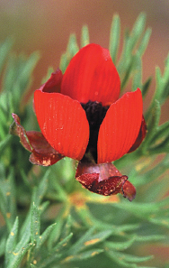 Branched, hairless annual of arable fields on chalky soils. FLOWERS Comprising 5–8 bright red petals that are blackish at the base (June–Aug). FRUITS Long-stalked, elongate, wrinkled. LEAVES Pinnately divided and feathery, upper ones partly shrouding flowers. STATUS Rare and decreasing because of agricultural herbicides.