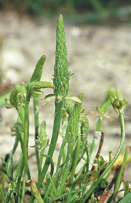 Tufted, inconspicuous annual of arable field margins, often on sandy soil. FLOWERS Long-stalked, 5mm across, with yellowish-green petals and sepals (Mar–July). FRUITS Elongate, plantain-like (see pp), to 7cm long. LEAVES Narrow, grass-like. STATUS Scarce and declining, mainly in S England.