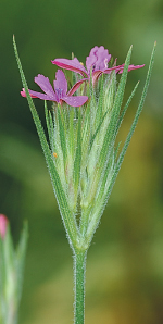 Dark green, slightly hairy annual. Found in dry, grassy places, mainly on chalk or sandy soils. FLOWERS 9–13mm across, with reddish-pink petals that have toothed margins and pale spots; in clusters (June–Aug). Note the long bracts. FRUITS Capsules. LEAVES Narrow. STATUS Scarce and local.