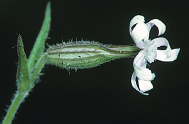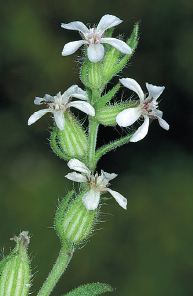 Stickily hairy annual of arable fields, mainly on chalk or sandy soils. FLOWERS Similar to White Campion but with petals pinkish above, yellowish below; inrolled by day, opening at night, when they are scented (May–July). FRUITS Capsules with 6 reflexed teeth. LEAVES Ovate. STATUS Local and declining.