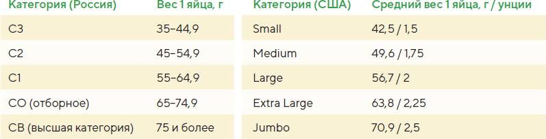 Таблица, приведенная ниже, показывает средний вес яиц разных категорий[5]. Вес отдельных яиц в коробке, как и средний вес яиц в каждой категории, может варьироваться.