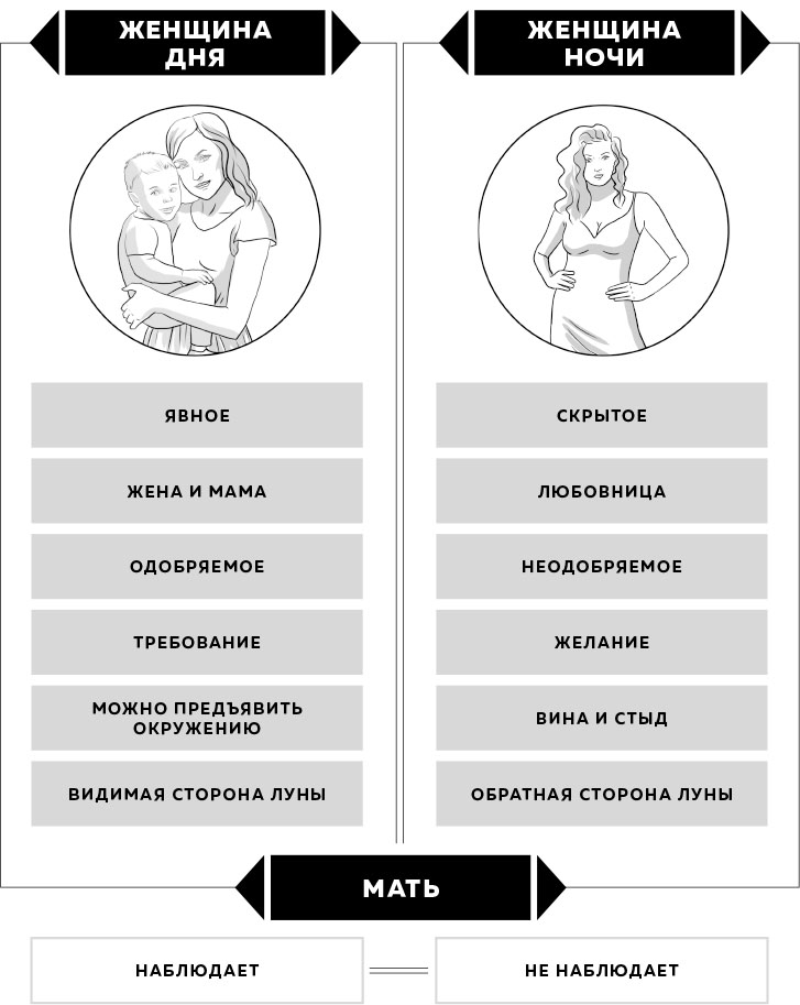 Бывает, что оба эти аспекта – дневной и ночной – сосуществуют в женщине более или менее бесконфликтно. Например, днем она чувствует себя хорошей матерью, заботливой женой, а ночью – в отношениях с мужем – ощущает себя желанной любовницей, которая удовлетворена своей сексуальной жизнью.