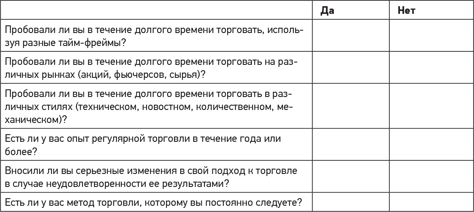 Первым шагом в поисках вашего уникального места в торговой вселенной является самооценка. В таблице 2 дается краткий список контрольных вопросов, касающихся опыта торговли. Потратьте минутку и ответьте «да» или «нет» на каждый из вопросов. Мы изучим ваши ответы и затем используем результаты для того, чтобы вы начали движение по пути к мастерству.