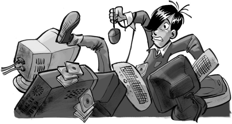 Довольный собой, он закинул ноги на письменный стол и принялся раскачиваться на кресле. Напрасно он так. Очень скоро пластмассовые детали не выдержали, и – БАБАХ! – Ларри свалился на пыльный ковёр; вместе с ним полетели провода, монитор и системный блок.
