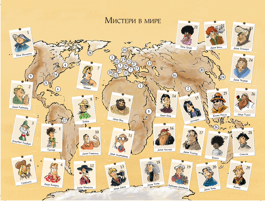– Ладно, не будем терять ни минуты! – вмешалась Агата. Она подошла к планисфере, на которой вот уже несколько лет размещала карточки с именами и фотографиями членов огромнейшей семьи Мистери, которые жили во всех концах мира.