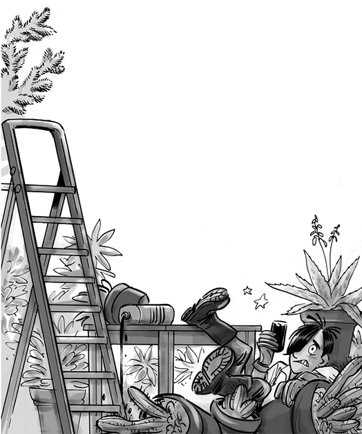 Юный детектив так и подпрыгнул от резкой боли и отшатнулся от коварного кактуса. К счастью, комбинезон был таким плотным, что горе-садовник почти не укололся, но от падения это его не спасло! На лету юноша зацепился за лианы, опрокинул пару цветочных горшков и бутылочку с удобрением и наконец рухнул на спину рядом со столом.