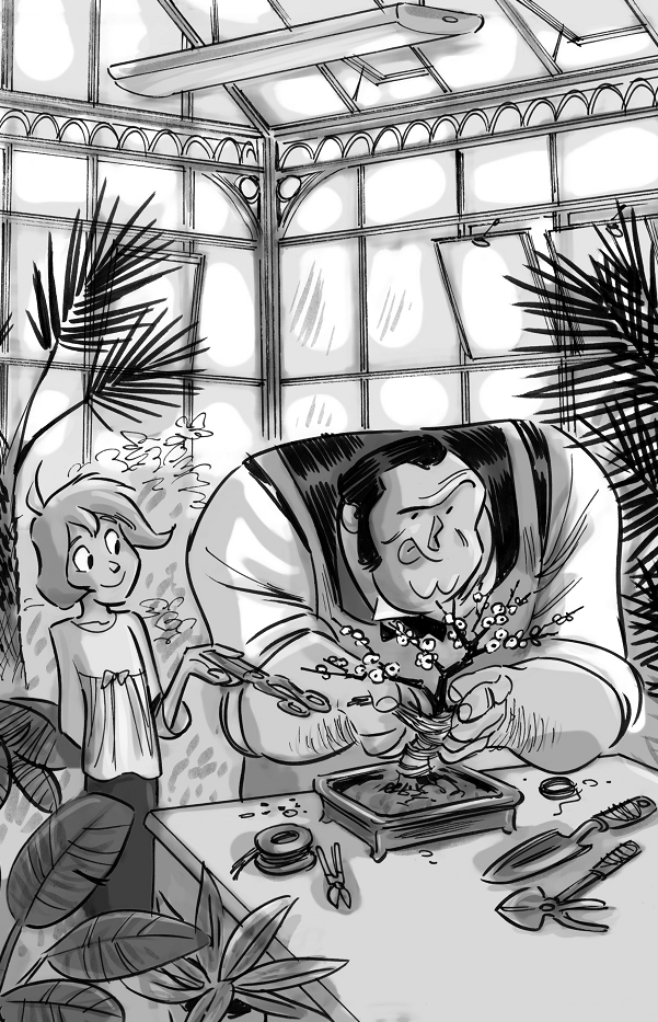 В это мгновение дворецкий колдовал над деревцем вишни, делая так, чтобы ветви и ствол росли в нужном направлении. Агата помогала ему, держа туго натянутым пучок рафии – натурального пальмового волокна. Девочка подняла изящный носик, зачарованная точными движениями огромных рук экс-боксёра.