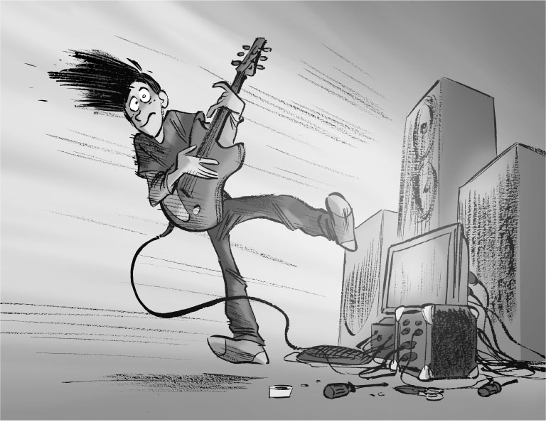 Включив вилку в розетку, юноша бросил взгляд на монитор, чтобы проверить частоты. Потом сделал вдох, прошёлся пальцами по струнам и попытался наиграть мотив из композиции группы «Лед Зеппелин».