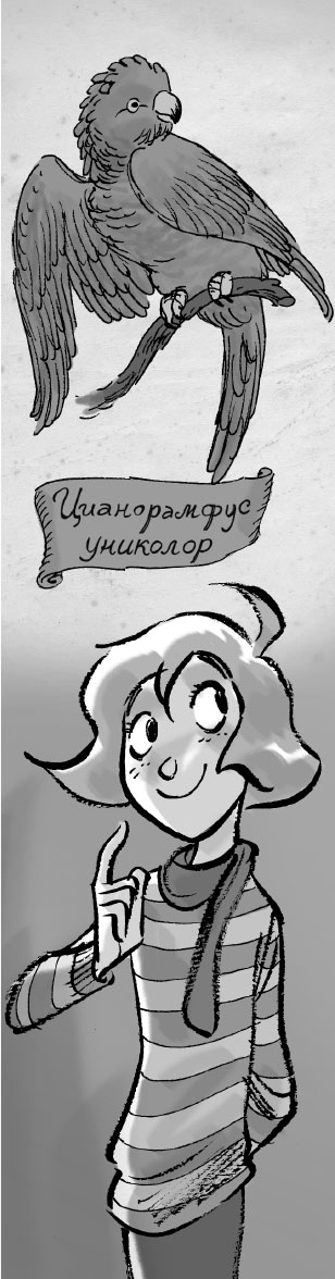 – Антиподский прыгающий попугай, или, если по-латыни, цианорамфус униколор! – счастливо воскликнула она, энергично прищёлкнув пальцами.