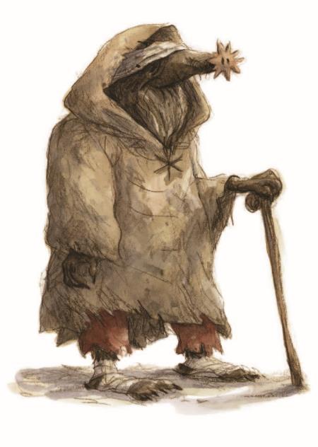 Вдруг я увидел человека, который медленно брёл по дороге. Очевидно, он был слеп, так как ощупывал перед собой дорогу палкой, глаза и нос его закрывала зелёная ширмочка. Он горбился то ли от старости, то ли от слабости, огромный ветхий морской плащ с капюшоном делал его ещё уродливее. Никогда в жизни я не встречал такого страшного на вид человека. Остановившись перед гостиницей, он произнёс нараспев странным и монотонным голосом, обращаясь в пространство: