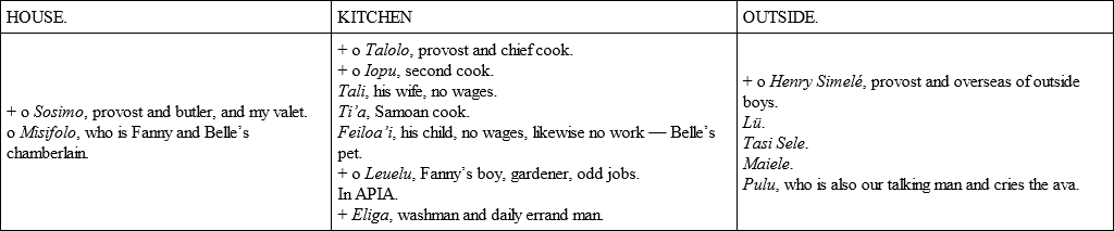 The crosses mark out the really excellent boys. Ti’a is the man who has just been fined half his wages; he is a beautiful old man, the living image of ‘Fighting Gladiator,’ my favourite statue – but a dreadful humbug. I think we keep him on a little on account of his looks. This sign o marks those who have been two years or upwards in the family. I note all my old boys have the cross of honour, except Misifolo; well, poor dog, he does his best, I suppose. You should see him scour. It is a remark that has often been made by visitors: you never see a Samoan run, except at Vailima. Do you not suppose that makes me proud?