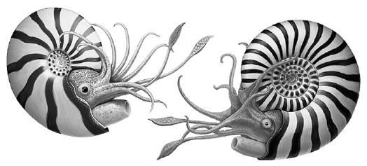 Палеонтологам теперь совершенно ясно, что в первые несколько миллионов лет истории головоногих не существовало никаких наутилоидов, а были только результаты разнообразных эволюционных экспериментов с труднопроизносимыми названиями – плектроноцериды, эллесмероцериды и ортоцериды (можете сразу их забыть). Термин «наутилоиды» присвоили ветви, из которой выросли современные наутилусы, – ветви, возникшей после того, как многие причудливые древние формы уже вымерли. Так что, хотя родословная наутилоидов довольно древняя, она не восходит к самым истокам.