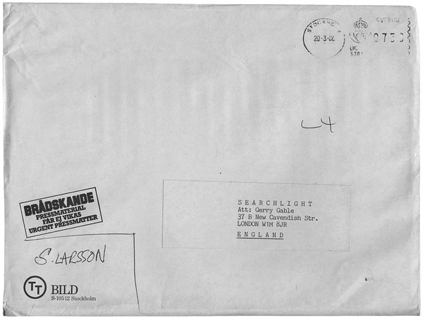 Письмо Стига Ларссона, написанное по-английски Джерри Гейблу 20 марта 1986 года