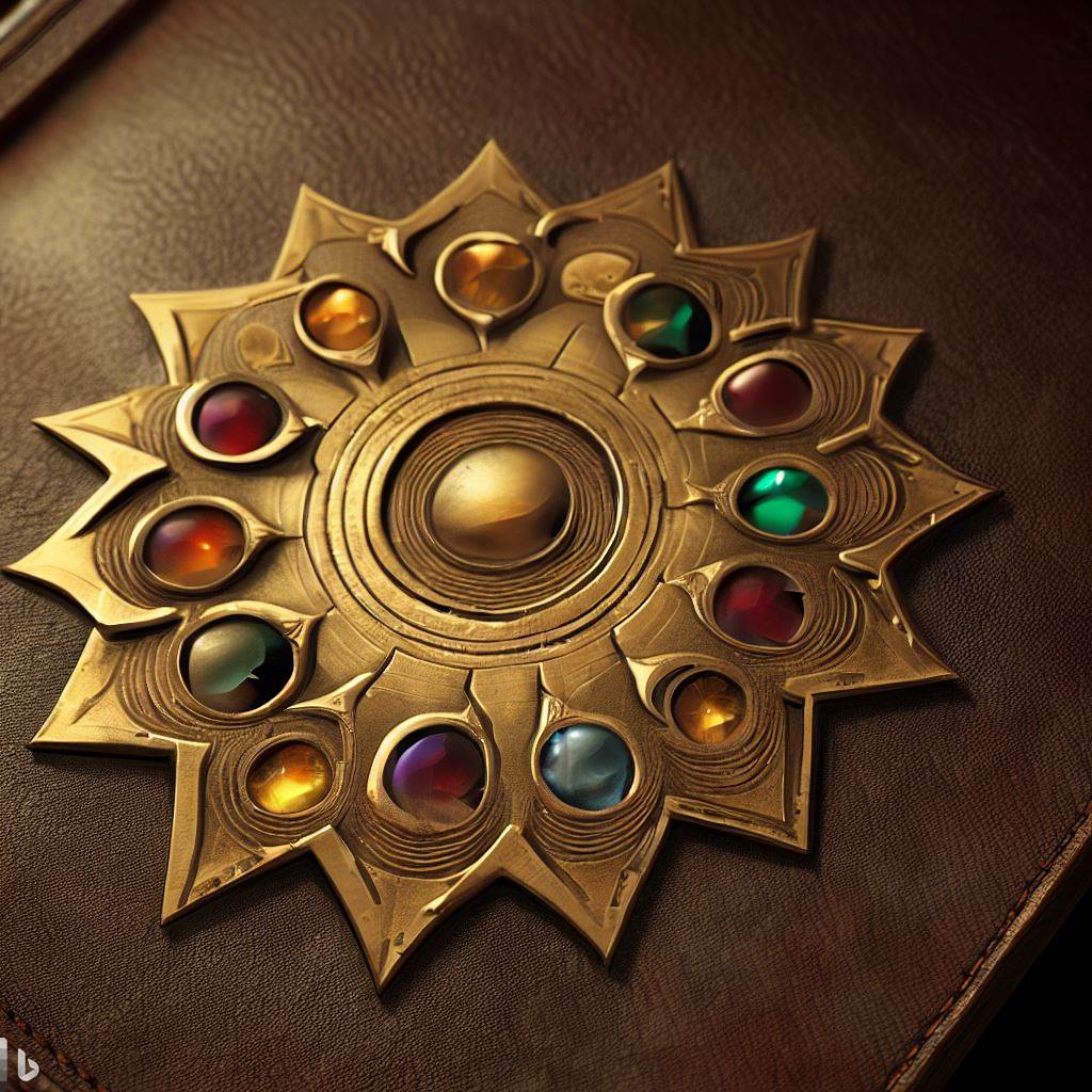 Обложка из толстой кожи. Вместо названия – золотой шильд в виде солнца с двенадцатью камнями по кругу.