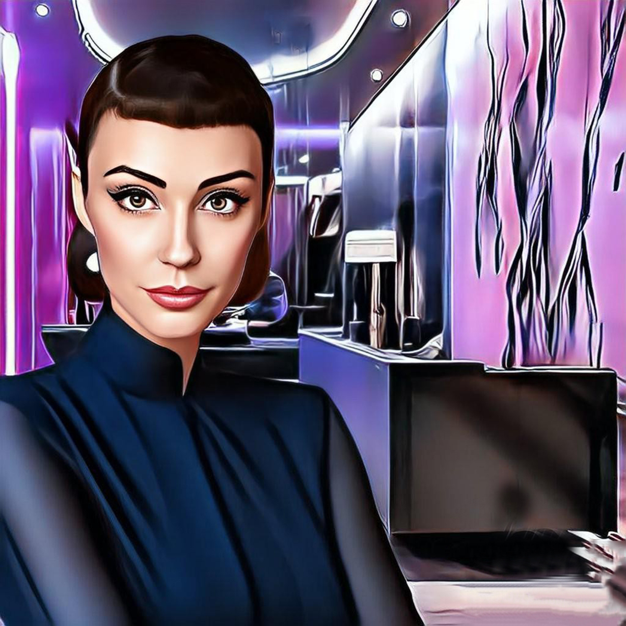 У входа располагалась стойка из тёмного дерева. За ней сидела с эффектная брюнетка-администратор в облегающем платье. Заслышав мелодичный перезвон колокольчиков над дверью, девушка встала, гордо выпрямилась и бросила на вошедших придирчивый взгляд.
