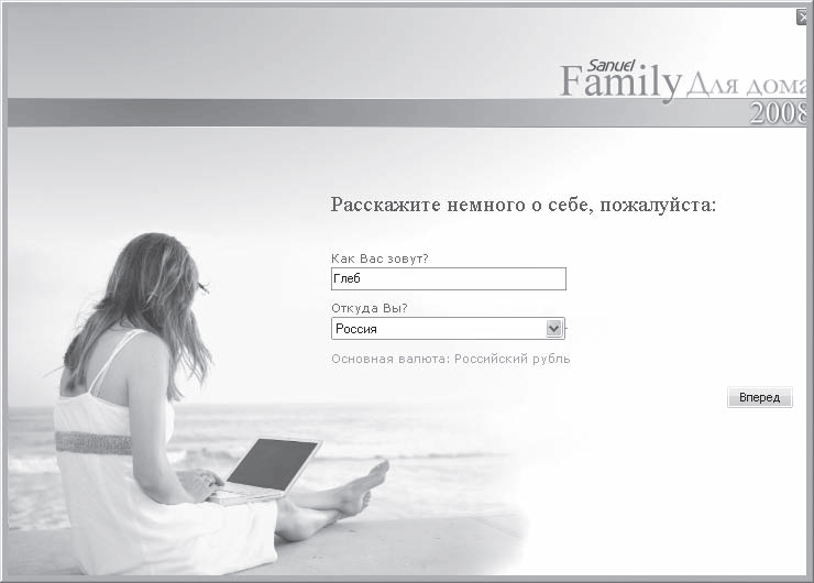 Для установки программы дважды щелкните кнопкой мыши на значке файла установки (setup2008ruHome.exe) и следуйте указаниям мастера. В процессе установки программа предложит немного рассказать о себе (рис. 1.1), при этом заведет первого пользователя и выберет основную валюту учета.