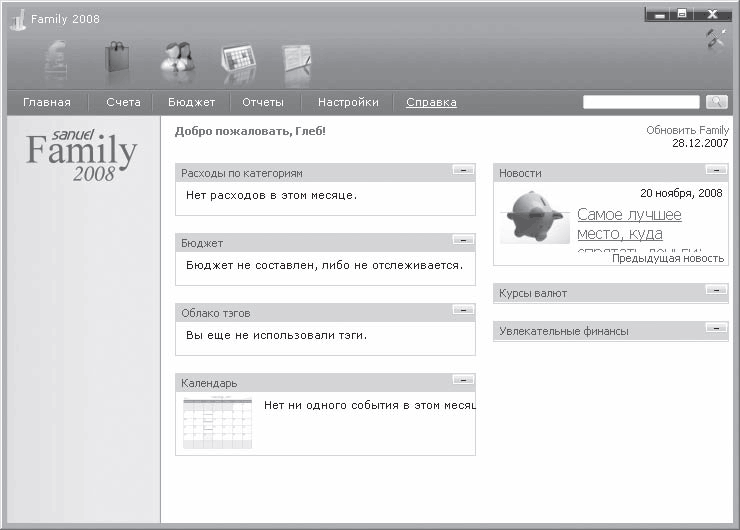 Если после завершения ввода основной информации о себе программа не запустилась автоматически, запустите ее вручную. Для этого выполните команду Пуск → Sanuel → Family 2008 Для дома → Family 2008 Для дома. Откроется главное окно программы (рис. 1.2).