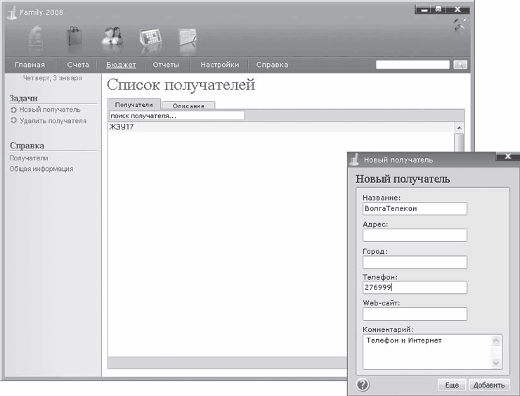• Получатели – те люди и организации, кому вы регулярно платите. Скорее всего, все магазины подряд в этот справочник вносить не стоит, однако для операторов связи или учреждений ЖКХ здесь самое место.