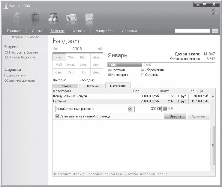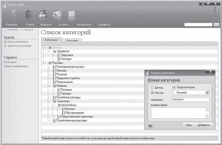 По большому счету, готовый список категорий охватывает почти все, с чем сталкивается обыкновенная семья. Далее расширять и дробить этот список, видимо, не стоит – чем он короче и проще, тем легче впоследствии вводить данные. Если у вас нет личного транспорта, категорию Автомобиль можно спокойно удалить – выделите этот пункт и в группе Задачи щелкните кнопкой мыши на ссылке Удалить.