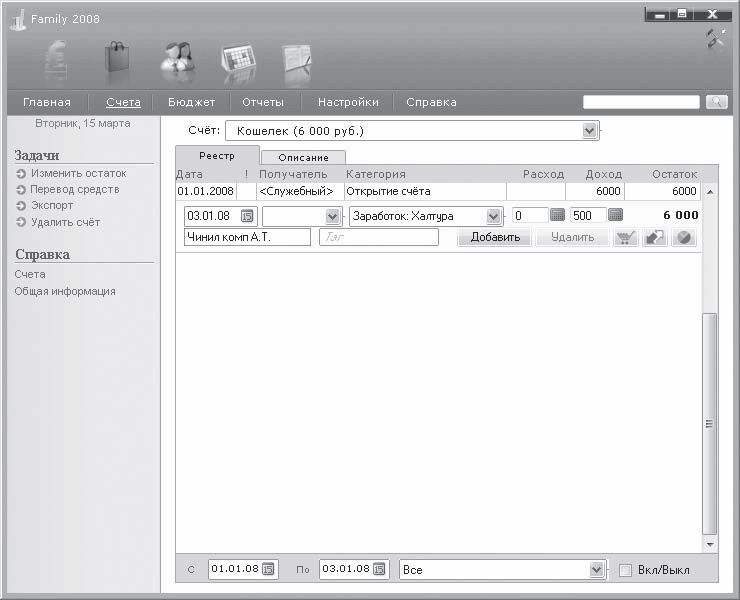 Щелкните кнопкой мыши на названии счета в списке, и вы попадете в реестр этого счета. Реестр – список операций, проведенных по счету. Самую первую операцию вы уже сделали, открыв счет, – положили на него начальный остаток. Для добавления записи в реестр выполните следующие действия.