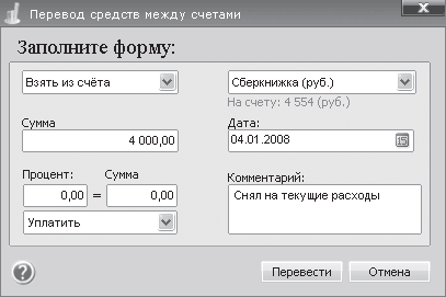 4. Заполните поля формы. Поскольку сейчас вы выполняете операцию перевода, находясь в реестре счета Кошелек, в первом раскрывающемся списке нужно выбрать значение Взять из счета, а во втором списке – Сберкнижка (руб.), поскольку деньги перечисляются со счета Сберкнижка на счет Кошелек. Поле Процент нужно заполнять только в том случае, если вы снимаете деньги через банкомат, когда банк берет определенную комиссию за обслуживание.