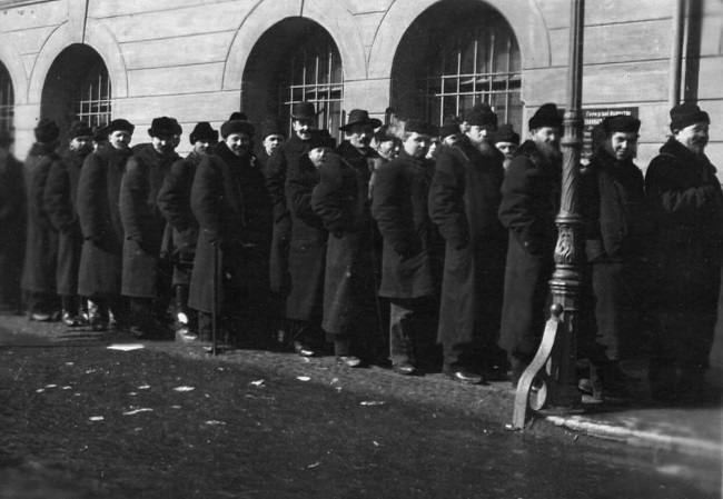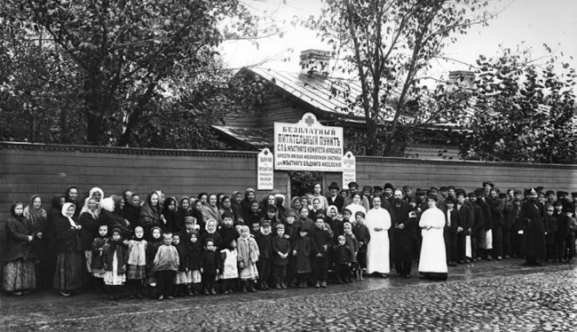 Жители Московской заставы у входа в бесплатный питательный пункт Санкт-Петербургского местного комитета РОКК. Санкт-Петербург. 1910 г.
