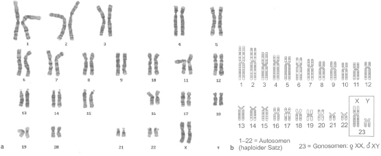 Abb. 3: unauffälliges Karyogramm a) einer Frau (Originalaufnahme) und b) eines Mannes (Schema) (Sonnleitner / Rojacher 2009, 56)