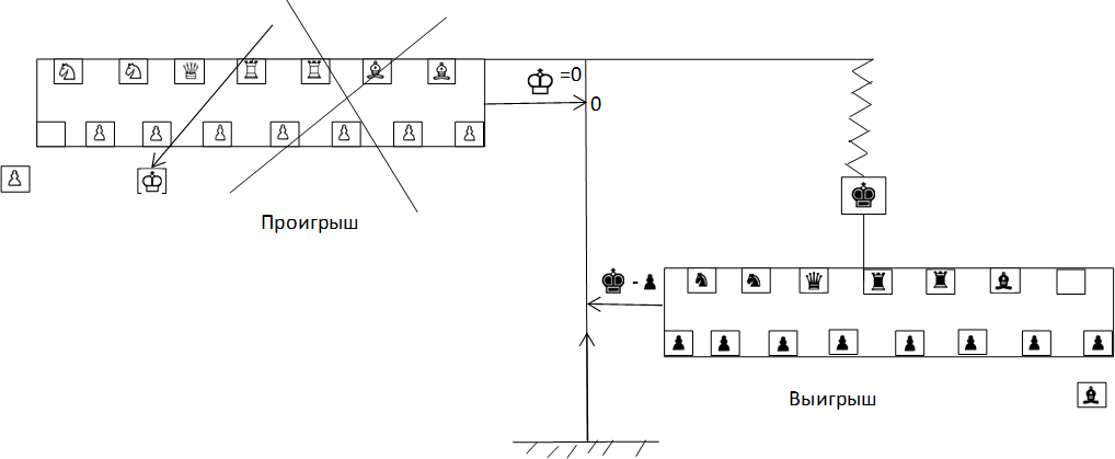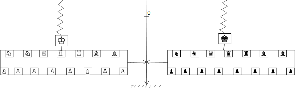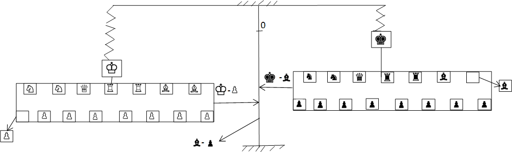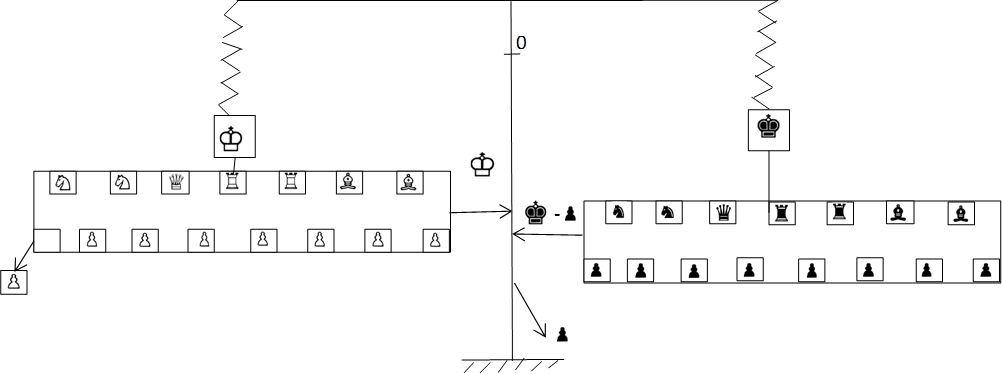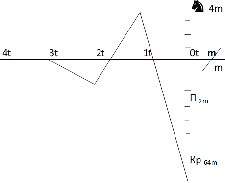 На графике на ее оси абсцисс откладываются последовательные ходы в партии, а на верхней и нижней полуординатах – соответственно черный и белый шахматный материал в выбранных нами единицах массы.
