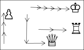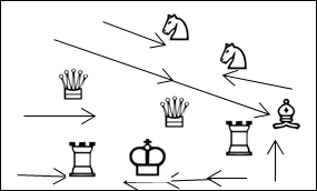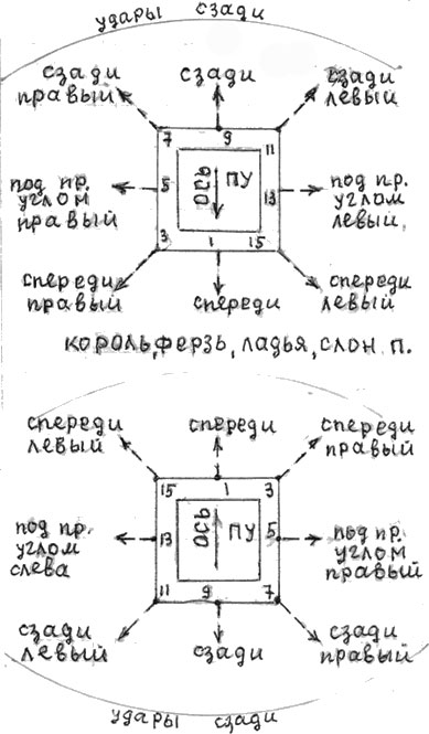 На рис 24 показаны ПУ таких белых и черных фигур как король ферзь, ладья, слон и пешка. Указаны оси их ПУ на исходном построении перед партией и во время ее на их позициях. Так же указаны места и номера их дв, оп.лин и противобл. элементов этих сил по периметру их расположения на этих фигурах. Штриховыми стрелками с полным наконечником указаны векторы прямых лин. ударов на соответствующих дистанциях. Также указаны названия ударных векторов относительно позиционных осей ПУ этих фигур.