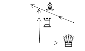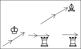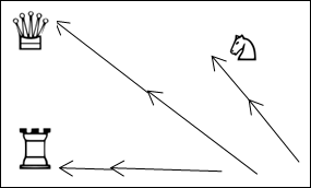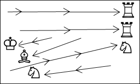 На рис. 23а показаны курсы фигур параллельные и перпендикулярные друг другу и рамки шахматной доски; на рис 23б – движение фигур относительно друг друга на встречных и совпадающих курсах; на рис. 23в – курсы одних фигур пересекают курсы других – спереди и сзади; на рис 23г и 23д – расходящиеся курсы; на рис 23е – сходящиеся и встречные курсы.