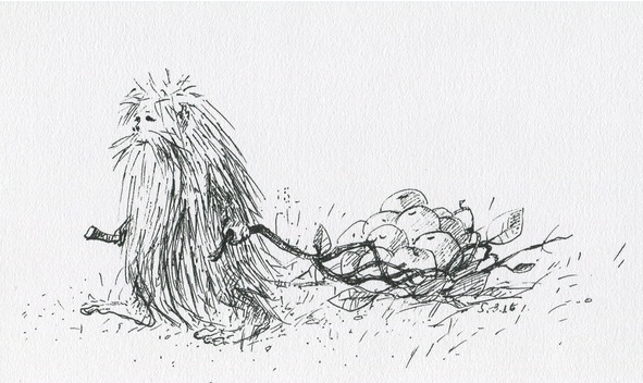 Прошло лето, наступила золотая осень, пора припасов и заготовок на зиму. Абрбнулю нравилось обустраивать свой дом. Он насобирал целую кучу орехов и ягод и уложил их слоями в специальные корзинки, которые собственноручно сплел из тонких ивовых прутьев. Хозяйственный гном насушил грибов и красиво подвесил их на плетеных веревочках почти к самому потолку. Он также договорился с дикими пчелами о том, что подыщет им новый удобный улей. Пообещав двум лешим немного меду, Абрбнуль заставил их выгрызть изнутри огромный древесный ствол. Пчелы вселились в новый дом, а лешие ушли довольные, сладко постанывая, слюняво жуя сладкие соты вместе с воском. Все были довольны. Но больше всех радовался предприимчивый гном – ведь он, ничего не делая, получил свою долю душистого дикого меда. Меда было столько, что должно было хватить на всю зиму.
