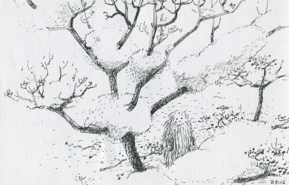 Шли дни, становилось холоднее, зачастили дожди, и Абрбнуль засел в доме. Оказалось, что нора состоит из глины. Немного поэкспериментировав, Абрбнуль сделал печку-камин. Он обжег несколько глиняных посудин и кипятил в них воду, заваривая душистый травяной отвар. Он даже научился делать суп: ловил форель в ручье и варил ее с корешками и травами. К тому времени борода отросла настолько, что мешала ходьбе. Абрбнуль привык обвязывать ее вокруг пояса и даже приспособился вешать на нее корзину. Подвязывая бороду, он обнаружил, что частично прижимает ею изрядно отросшую шерсть. Шерсть отросла так, что путалась, цепляясь за кусты, и мешала ходить. Однако благодаря шерсти было тепло, несмотря на дожди и холод.