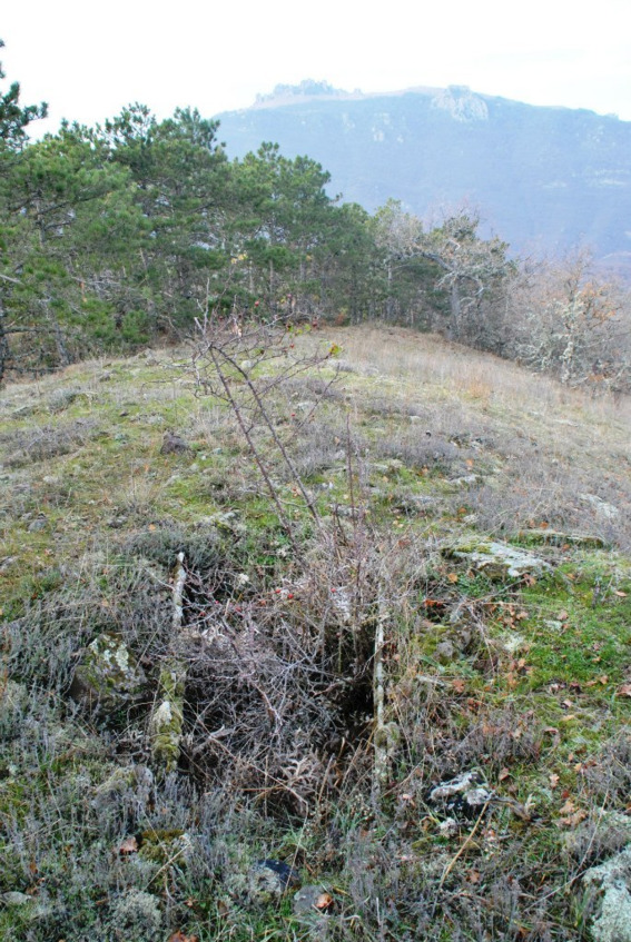 Именно на нём находится первый комплекс дольменов, состоящий изначально из четырёх поставленных в одну линию. На фото они видны едва различимо, т.к. стенки дольменов полностью «утоплены» в грунт.