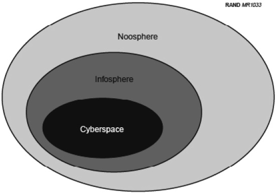 Схема атакуемых общественных областей. Киберобласть – только часть инфосферы, которая только часть ноосферы, включающей весь социум. Эти области коррелируют, так что нападения и изменения в одной области влияют на все остальные.