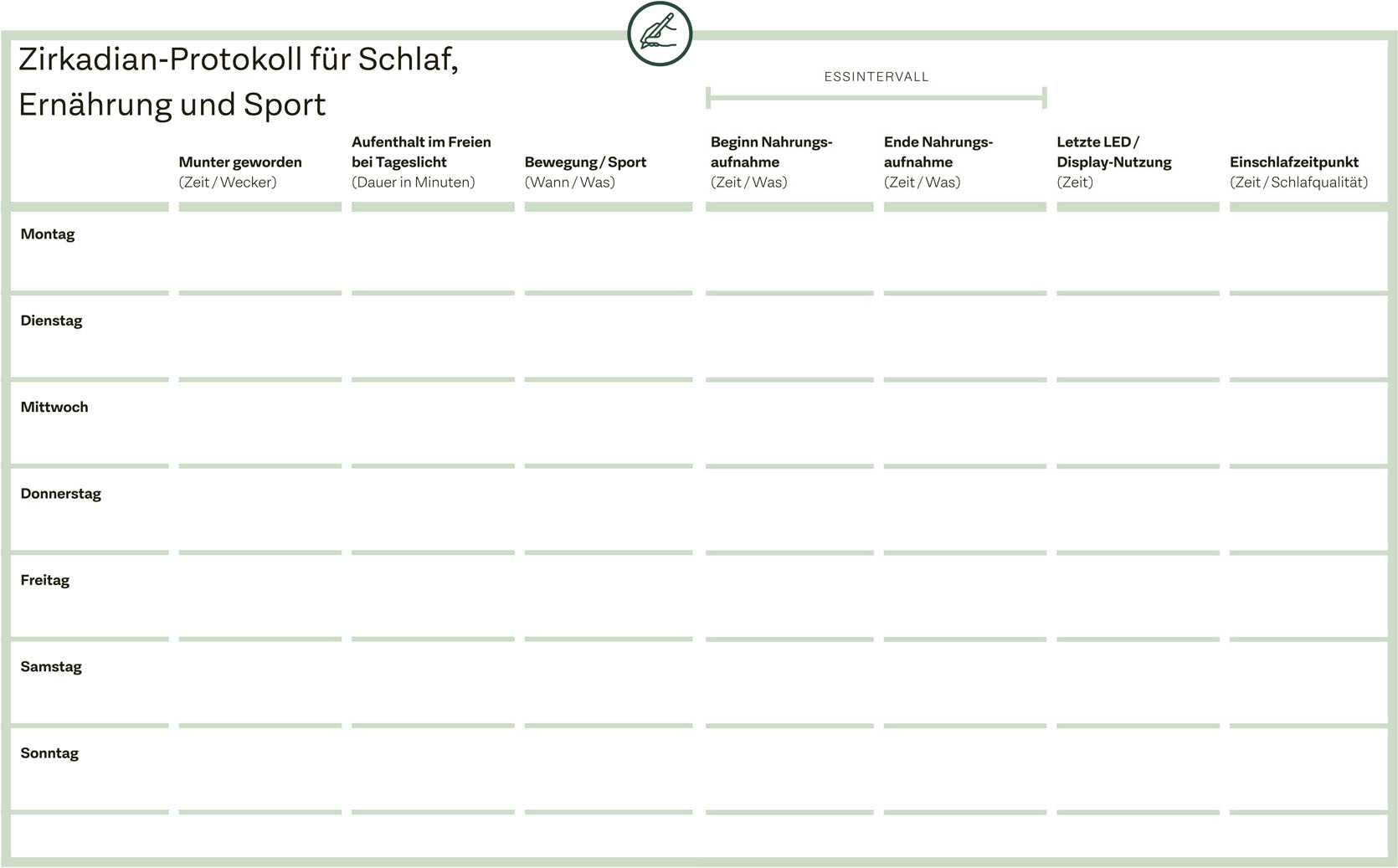 Falls Sie Ihren zirkadianen Rhythmus bei Bedarf ändern und optimieren wollen, ist es hilfreich, zuerst einmal Ihren gegenwärtigen Rhythmus zu bestimmen. Nehmen Sie sich die Zeit und füllen Sie das Zirkadian-Protokoll auf den folgenden Seiten zumindest eine Woche lang aus, um den Status quo zu bestimmen. Wann sind Sie ca. aufgewacht und haben Ihre Augen geöffnet? War dazu ein Wecker notwendig? Wann sind Sie zu Bett gegangen? Wie lange haben Sie ca. gebraucht, um einzuschlafen? Wie war die Schlafqualität? Zu welcher Zeit haben Sie zum letzten Mal auf einen Bildschirm gesehen (inkl. Smartphonedisplay)? Wann haben Sie den ersten Bissen des Tages gegessen? (Hier gilt jede Kalorienzufuhr, also auch kalorienhaltige Getränke wie Kaffee mit Milch oder Fruchtsäfte.) Wann haben Sie den letzten Bissen des Tages zu sich genommen? Wann und wie viel Bewegung haben Sie gemacht, und wie lange haben Sie sich im Freien aufgehalten?