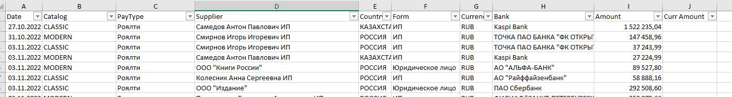 Представим, что у нас имеется небольшая компания, выплачивающая роялти авторам книг, которая ведет свой учет в 1С. 1С, несмотря на свой богатый функционал, все же не обладает развернутыми аналитическими инструментами, позволяющими всесторонне проанализировать выплаты. Однако менеджмент компании хочет наглядно и доступно видеть расширенную информацию о платежах. Например, быстро и просто увидеть, сколько роялти было выплачено, а сколько авансов, с какими банками чаще всего приходится взаимодействовать, в какие страны чаще всего совершаются платежи и в какой валюте. Вся эта информация поможет бизнесу оптимизировать и улучшить денежные поток, тем самым, уменьшив расходы и высвободив ресурсы для других задач.