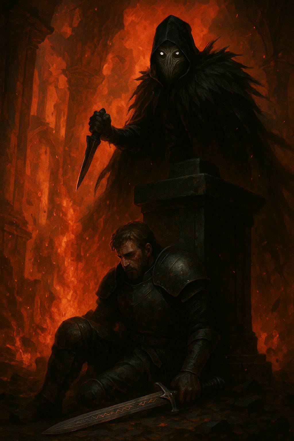 Арран прислонился спиной к алтарю, чувствуя, как раскаленный камень прожигает доспехи. Каждый вдох обжигал легкие, словно он проглатывал раскаленные иглы. Его клинок, выкованный из звезды, много веков назад упавшей на землю, украшенный рунами, беспомощно лежал на каменном полу и слабо мерцал. Символы, которыми он сам когда-то с гордостью украшал гарду и лезвие, теперь казались шрамами на уставшем металле. Доспехи, прошедшие сквозь сотни битв, были изуродованы следами когтей, зубов и магии. От левой наплечной пластины осталась лишь половина – остальное вырвал демон, которого Арран все же сумел перерубить своим пылающим клинком.