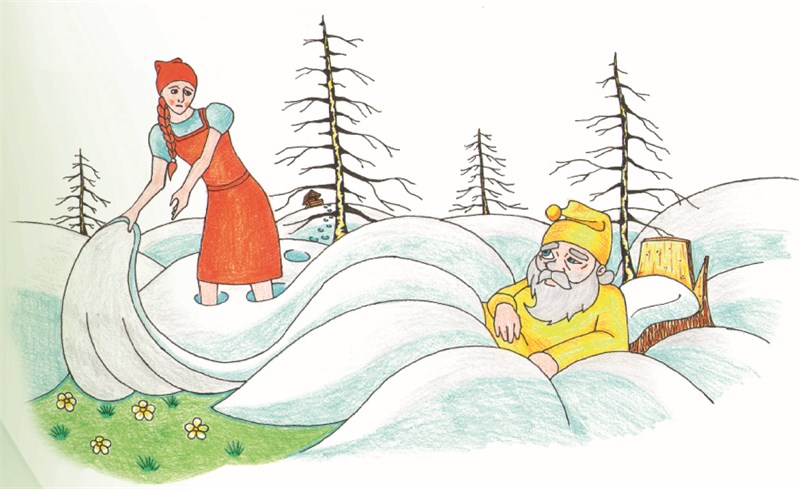 Сегодня, тихим вечером,Я расскажу вам сказку —Старинную-престарую;(И вам сюжет знаком)…Но будет в ней отличие:Рассказывать ту сказкуЯ стану стихотворным(И лёгким!) языком.Ну, слушайте, детишки…В домишке небольшомЮтились две сестрицы(И с нянюшкой притом).Суровая и строгаяТа нянюшка былаИ старшей поручалаСестрице все дела:Стирает Рукодельница,Готовит, трёт полы.От дальнего колодцаНесёт ведро воды.Водицу очищает:В бумажный льёт кулёк —Процеживает мутнуюСквозь уголь и песок.…Ленивица на печкеЛежит, не зная бед;Слезает с печки, толькоКогда готов обед.Измучившись бездельем,Считает мух в окнеИ стонет-причитает:«Ох, как же скучно мне!»И так бы – неизменно —Их дальше жизнь текла,Когда бы с РукодельницейВдруг не стряслась беда:В колодец уронила,Набрав воды, ведро —Оборвалась верёвка,Ну вот ведь как назло!Зря плакала-рыдала,Не хочет няня внять:«Сумела утопить ведро,Сумеешь и поднять!»Ну что тут делать будешь?Семь бед – один ответ:Спустилась РукодельницаВ колодезь… Чудный светЕё глазам открылся!Вдруг печка перед ней!Из печки пирожочекРумяный шепчет ей:«Возьми меня, сестрица,В дорогу ты с собой.Мне в печке не сидится!Неси за пазухой!»Идёт девица дальше;Пред нею – дивный сад!На золотых деревьях —Ах! – яблочки висят:«Мы, яблочки, созрели!Умылись мы росой!Стряси нас с ветки, девица!Возьми и нас с собой!»Подставила передникИ тянет за сучок;И наливные яблочкиСнимает, как в мешок.Ну, дальше РукодельницаОтправилась… Идёт,И тут – Мороз ИвановичПред нею предстаёт.Сидит седой наш дедушкаНа ледяной скамье,И снежные комочки —В пребелой бороде.«Ну, здравствуй, мил-девица!Тебя я видеть рад!»Как инеем искритсяУ дедушки наряд!Дохнул – и пар клубится:«Давно я не едалГорячего обеду!»И ей навстречу встал:«Садись, девица, рядом!Покушаем с тобой!Какое угощеньеТы принесла с собой?»«Несу, Мороз Иванович,Тебе я пирожокИ яблок позолоченных…» —Ей, бедной, невдомёк,Что знал Мороз ИвановичПро всю её беду,Ведёрко сохранил её…Поел старик: «Пойду —Прилягу. Чаще мнеПотребно отдыхать…Ты взбей-ка мне перинуИ постели кровать.Отдам тебе ведёрко!Но прежде ты должнаТри дня прожить в дому моём —Прилежна и умна:Варить обед и штопатьРубахи и бельё;Мести полы. И будетВ награду – всё твоё:Тебе – в твоё ведёрко —Насыплю я монет,И одарю я брошью —Красивей в мире нет!»Осталась РукодельницаУ дедушки в дому —Во всём ему помощница,Во всём с душой к нему…Одно лишь непонятно ей:Зачем у старикаПод мягкою периной —Зелёная трава?«Скажи, Мороз Иванович:Я знаю – добрый ты,Но леденишь периноюЗачем траву-цветы?»«Не так на деле, внучка!Траву не леденю!Под снежным покрываломЕё к весне храню.Весна придёт-наступит,Растопит снег; и вот,Досыта напитавшись,Трава быстрей взрастёт!Появится и колос…А люди соберут —В зерно его смолотят,На мельницу свезут.Намелет добрый мельникМуки надолго впрок —Ты сможешь, Рукодельница,Не раз испечь пирог…»«Я понимаю, дедушка!И вижу я сейчас:Ты с мудрою заботоюУстроил всё для нас!Но почему же, дедушка,Свой ледяной дворецТак глубоко запрятал ты —В холодный студенец?»«Ну вот ты и ответилаНа свой вопрос сама!В колодезе и в жаркий день —Студёная вода.Придёт весна-красавица,И мне невмоготу:Все косточки прожарит мне!Уж лучше я пойдуВ свои хоромы снежныеВ колодезе, на дне!Придёт зима – вновь постучуВ окошечко к тебе!»«Зачем, Мороз Иванович,Стучишь в дом 