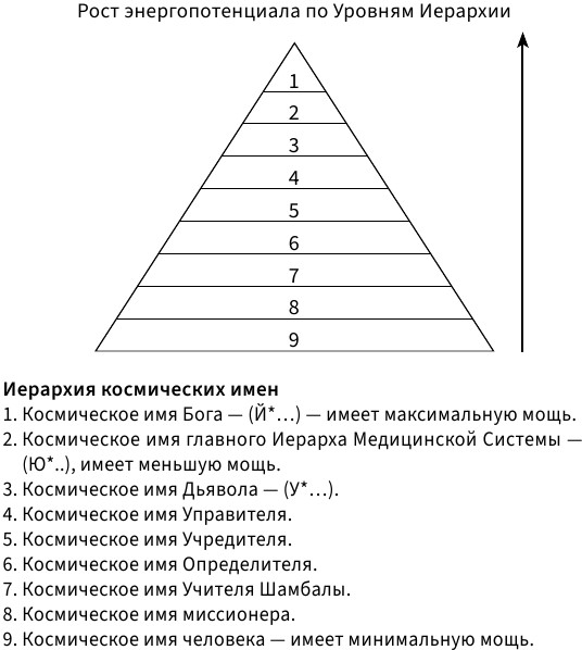 Космические имена Высших Сутей* не подлежат разглашению. Причина этого кроется в том, что они имеют особое энергетическое построение, несут гораздо большую мощь, чем простые человеческие имена. А если это имена Бога, Иерарха медицинской Системы или Дьявола, то им свойственен огромный энергопотенциал*.